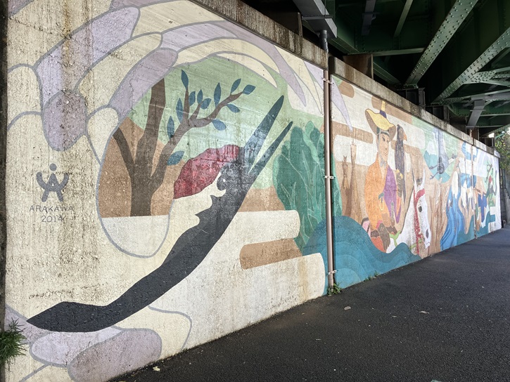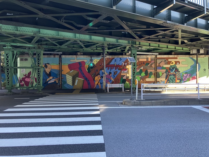 ガード下の両面には長大な壁画が描かれています。壁画には、黒羽藩大関増業公のストーリーが再現されています。増業公が研究した織物(染色法)や甲冑が配置されています。この壁画は、平成二十五年(2013年)に制作されました。