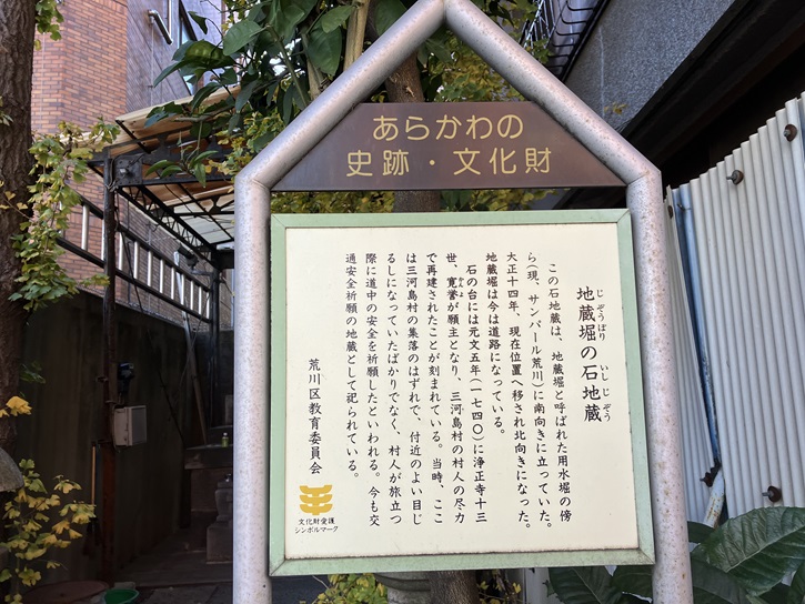 この石地蔵は、地蔵堀と呼ばれた用水堀の傍ら(現、サンパール荒川)に南向きに立っていた。大正十四年、現在位置へ移され北向きになった。地蔵堀は今は道路になっている。石の台には元文五年(1740年)に浄正寺十三世、寛誉が願主となり、三河島村の村人の尽力で再建されたことが刻まれている。当時、ここは三河島村の集落のはずれで、付近のよい目じるしになっていたばかりでなく、村人が旅立つ際に道中の安全を祈願したといわれる。今も交通安全祈願の地蔵として祀られている。