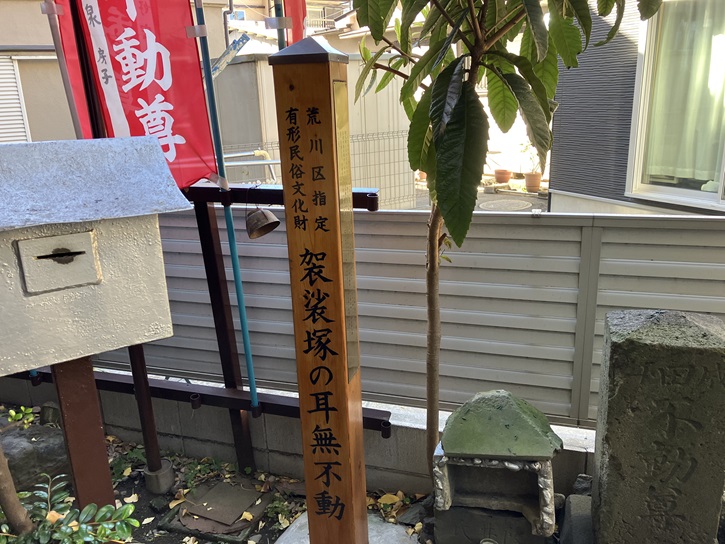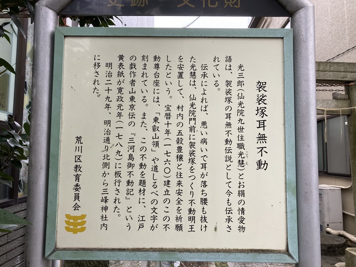 荒川公園の向かいに三峯神社があります。境内にある「袈裟塚の耳無不動」は、仙光院住職第九世光慧の建造とされています。光慧と吉原の遊女との波乱に満ちた悲劇的情愛物語が地域に伝わっています。山東京伝の「三河島御不動之記」という黄表紙に別のお話としても登場します。袈裟塚の上に建てられた不動明王は、左耳が無く、耳の病などにご利益があると伝えられ、穴をあけたお椀を奉納する慣わしがあります。