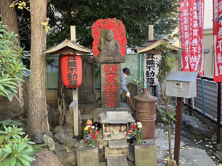 The pure love story of Senko-in Temple's 9th chief priest Koe (Kozaburo) and Okinu has been handed down to today as the legend of the Earless Fudo (Acala) of Kesazuka mound. According to the legend, Koe lost ears and energy due to severe illness. Then he buried dirty surplice into a mound in front of the Senko-in gate, placed the stone Fudo on it, and prayed for a good harvest of grains and safe travels. This Fudoson was built in 1760, engraved with "Toeizan Territory" and the characters for signpost. Also, the illustrated entertainment book "Mikawajima Gofudoki" written by Santo Kyoden, a writer in the Edo period, was published in 1789 based on the subject of this Fudo. In 1896, the Fudo was moved from the site on the north side of Meiji Dori Street to Mitsumine Shrine.