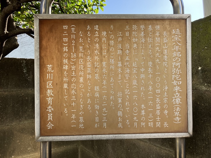 長盛山道慶院という浄土宗の寺。長保年間(999年〜1004年)長盛居士開基と伝える。慶長十八年(1613年)明誉善海によって中興された。本尊の阿弥陀如来に「延宝八歳(1680年)九月三日、当寺五代海誉」と記されている。江戸後期〜幕末まで、将軍の「鶴お成り」の際のご膳所にあてられた。境内には、寛永六年(1629年)三月建立の清水外記の墓、眼病に効き目があるという長盛薬師などがある。なお、荒川区役所裏の「うなぎや墓地(荒川2−18)」出土の応永三十一年(1424年)銘の板碑を所蔵している。