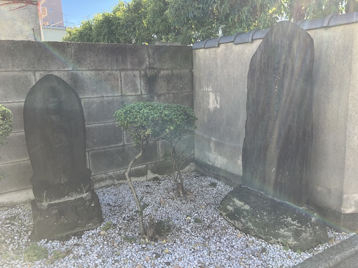 境内には、石刻の仏で眼病のご利益があるという長盛薬師が祀られています。碑文が読み取れませんが、板碑は右側の写真の石碑でしょうか?