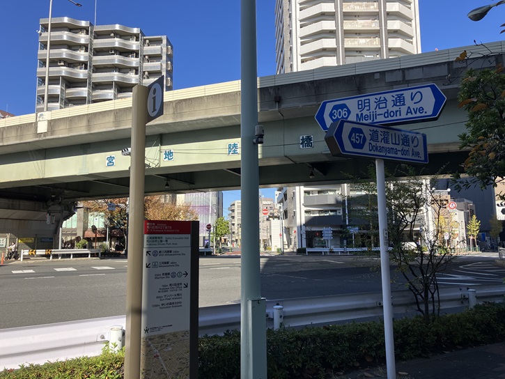 日本には大きな交差点に住宅地に進入するための路地を追加するなどして、多叉路になった場所がいくつもあります。宮地交差点は、荒川区荒川にある宮地陸橋の下にある多叉路です。明治通りと尾竹橋通りの交差点に、道灌山通りと3本の細い道路が接続された8叉路です。この交差点は、昭和三十年代までロータリーだった場所で、幹線道路の明治通りや尾竹橋通りが交差点内で微妙に屈折しているのはその名残りです。