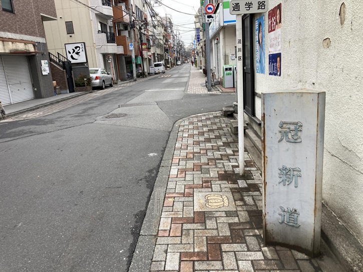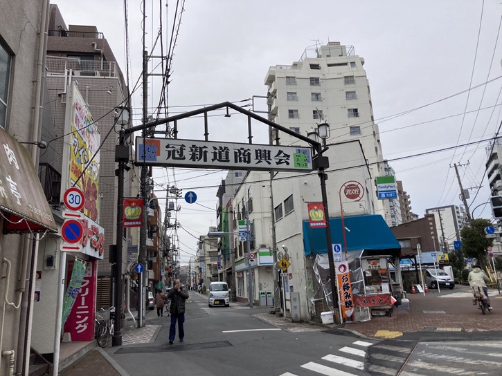 明治通りに面して、冠新道の入口があります。冠新道商興会は、戦後すぐから賑わいを見せ始めた商店街で、通りには肉屋・青果店・花店・洋品店などの物販の店が地元の人たちの暮らしを支えています。「イベント商店街」の別名を持つ冠新道商興会は、その名の通り一年中多彩なイベントで賑わっています。3月の桜まつり・7月の夜店市&盆踊り大会・9月の佐渡おけさ・10月のハロウィンなど様々な催しが実施されています。ちなみに、冠新道の名称の由来ですが、冠新道の「冠」は江戸時代に新堀村の名主を務めた冠家の名字に関係しています。冠家は、現在の西日暮里地区に多くの土地を所有していた大地主で、近代には冠権四郎氏が日暮里町の助役を務めるほどの地域の有力者でした。冠権四郎氏は、大正五年(1916年)に現在の西日暮里六丁目の辺りの所有地を区画整理して冠町一〜三丁目と名付けました。その際、同時に道路を新設したのですが、これが冠新道だったのです。つまり「冠町の新しい道」が、文字通り冠新道と命名されたのです。