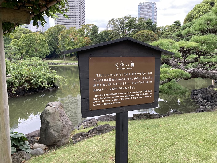 浜離宮の広大な敷地には様々な見所があります。池の真ん中に小島があり、そこに中島のお茶屋が建っています。島に渡る橋がお伝い橋です。池に造られたとはいえ、結構な長さですね。