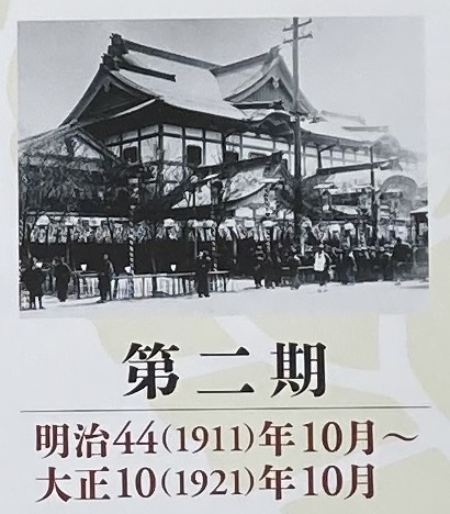 外観が洋風だった第一期歌舞伎座から外観・内観ともに純然たる日本風の劇場へと改築され、第二期歌舞伎座は落成した。明治四十四年に開場した帝国劇場との差別化が図られ、外観は純日本式の奈良朝宮殿風の造りに改められた。客席天井は金箔置二重打上げの格天井となり、二個のアーク灯を設置したのをはじめ、無数の電灯を備えた。開場初の興行は「五代目中村歌右衛門襲名披露」。大正二年に松竹の創業者大谷竹次郎が経営を任され、当時の松竹合名会社が一手に興行を担うようになる。