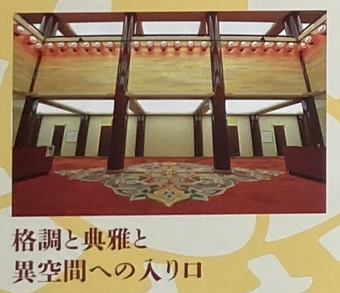 歌舞伎座の玄関口である大間は、吹き抜けの空間が広がり、濃朱の丸柱が聳え、足元には熟練の織手によるめでたい昨鳥文様の美しい赤い緞通(だんつう:絨毯)が敷かれ、 劇場を訪れた人々を優美な異世界へと誘う。