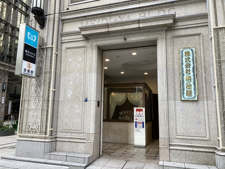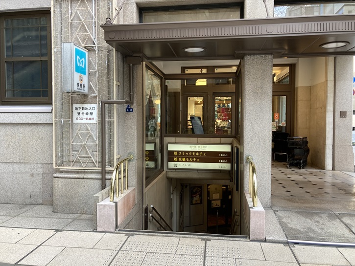 スタート地点の東京メトロ京橋駅7番出入口から歩き始めます。京橋駅の真上に建つ明治屋京橋ビルには出入口が3ケ所あり、7番出入口の階段下には「スナックモルチェ」、8番出入口の階段下には「京橋モルチェ」、9番出入口の階段下には「明治屋ワイン亭」があります。