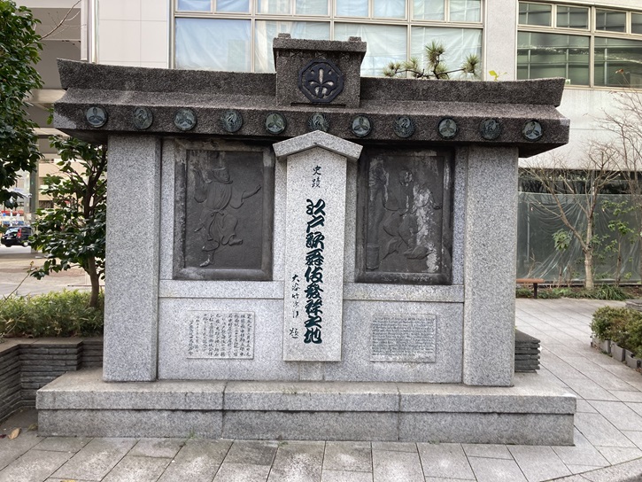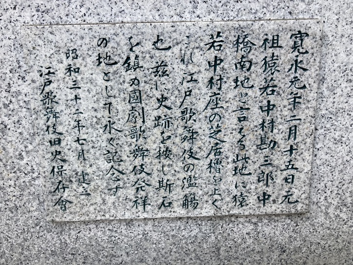 寛永元年二月十五日、元祖猿若中村勘三郎、中橋南地と言える此地に猿若中村座の芝居櫓を上ぐ。これ江戸歌舞伎の濫觴也。茲に史跡を按し、斯石を鎮め国劇歌舞伎発祥の地として永く記念す。