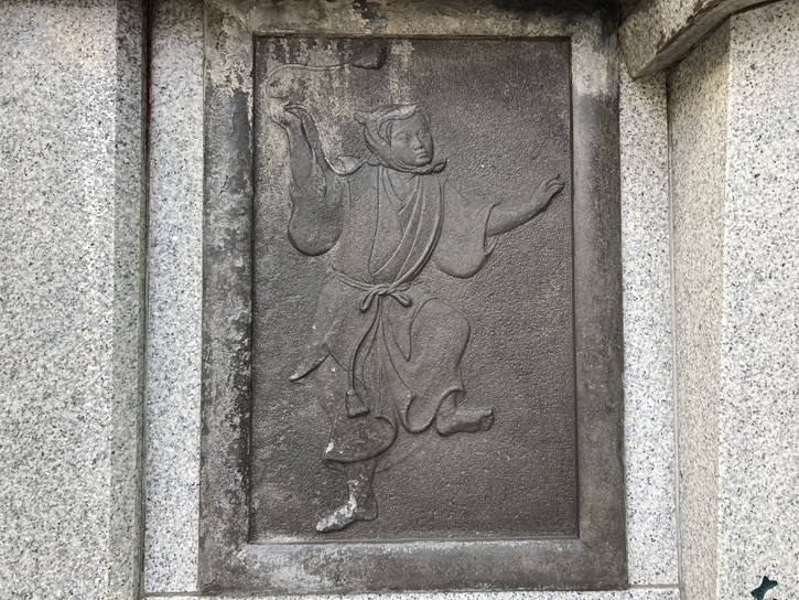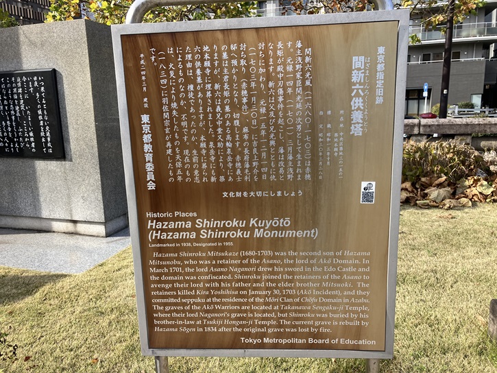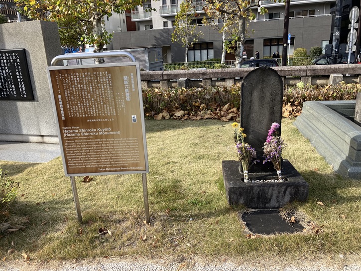 Hazama Shinroku Mitsukaze (1680-1703) was the second son of Hazama Mitsunobu, who was a retainer of the Asano, the lord of Ako Domain. In March 1701, the lord Asano Naganori drew his sword in the Edo Castle and the domain was confiscated. Shinroku joined the retainers of the Asamo to avenge their lord with his father and the elder brother Mitsuoki. The retainers killed Kira Yoshihisa on January 30, 1703 (Ako Incident), and they committed seppuku at the residence of the Mori Clan of Chofu Domain in Azabu. The graves of the Ako Warriors are located at Takanawa Sengaku-ji Temple, where their lord Naganori's grave is located, but Shinroku was buried by his brother-in-law at Tsukiji Hongan-ji Temple. The current grave is rebuilt by Hazama Sogen in 1834 after the original grave was lost by fire.