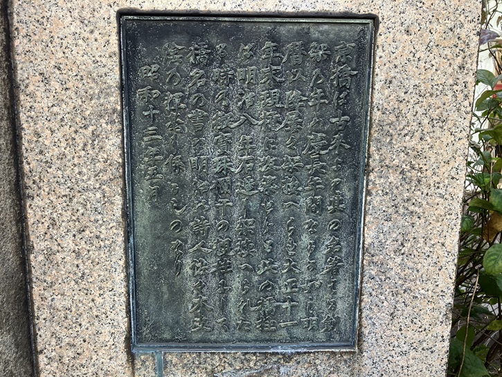 親柱3基のうち、中央通りの東側には明治時代に設置された親柱2基が保存されています。その内の1基の親柱の横に石碑が並んで置かれています。碑文には古めかしい説明文が書かれています。