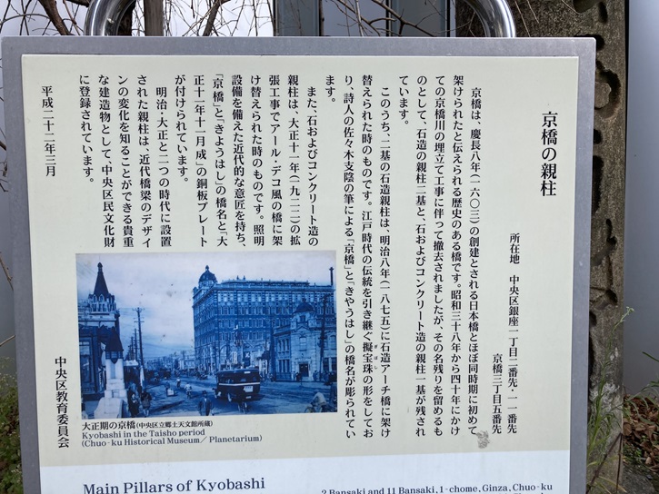 京橋は古来より其の名著える創架乃年ハ慶長年間なるが如し明暦以降数々架換へられ大正十一年末現橋に改築せらる此の橋柱は明治八年石造に架換へられたる時の擬寶珠欄干の親柱として橋名の書ハ明治の詩人佐々木支陰乃揮毫に係るものなり