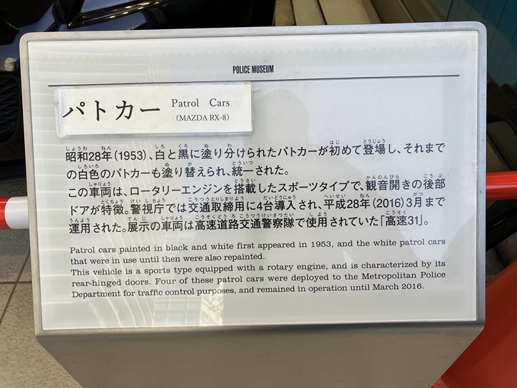 昭和二十八年(1953年)、白と黒に塗り分けられたパトカーが初めて登場し、それまでの白色のパトカーも塗り替えられ、統一された。この車両は、ロータリーエンジンを搭載したスポーツタイプで、観音開きの後部ドアが特徴。警視庁では交通取締用に4台導入され、平成二十八年(2016年)3月まで運用された。展示の車両は高速道路交通警察隊で使用されていた「高速31」。