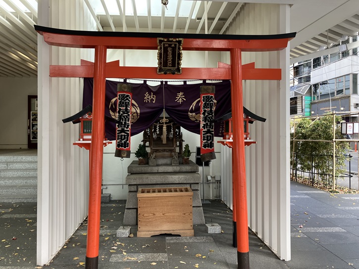 歌舞伎座の敷地の隅に赤い鳥居のミニ神社が祀られています。神社名は「歌舞伎稲荷神社」となっています。歌舞伎稲荷神社は、もともと歌舞伎座の中にあり、歌舞伎俳優・劇場関係者・歌舞伎を見るために入った方しか参拝することができませんでした。しかし、歌舞伎座の建替えに伴って、歌舞伎座の正面玄関の右側の地下鉄東銀座駅出入口エスカレーター前に遷座されました。これにより一般の方も自由に参拝できるようになりました。歌舞伎稲荷神社の御由緒や創建年代等は不明ですが、御祭神は歌舞伎稲荷大明神とされています。歌舞伎興行の安全・大入りや、観客・舞台関係者の平穏無事を祈願して祀られている神社です。また、祭祀は近くの中央区湊一丁目にある「鉄砲洲稲荷神社」の神職が行っており、こちらの御分霊を祀っているとも云われています。また、歌舞伎の初日と千穐楽に奉告祭がおこなわれます。毎年十月下旬から十一月初旬にかけて開催される「オータムギンザ」の一環として、銀座各所に祀られる小祠を巡るというイベント「銀座八丁神社めぐり」が実施されていますが、歌舞伎稲荷神社もその一社です。蛇足ですが、千穐楽(千秋楽・千穐楽・千龝樂と同意語)とは、複数日にわたって同じ演目を行う興行において「最終日」を指す業界用語です。縮めて楽日や楽ともいわれます。本来は江戸期の歌舞伎や大相撲における用語でしたが、現在では広く演劇や興行一般で用いられています。普通は「千秋楽」と書きますが、「千穐楽」など異体字での表記は「秋」の文字にある「火」を忌んで、同音にもなる音符亀に置き換えたものです。これは、江戸時代の芝居小屋は特に出火や延焼に悩まされることが多かったための忌避といわれています。
