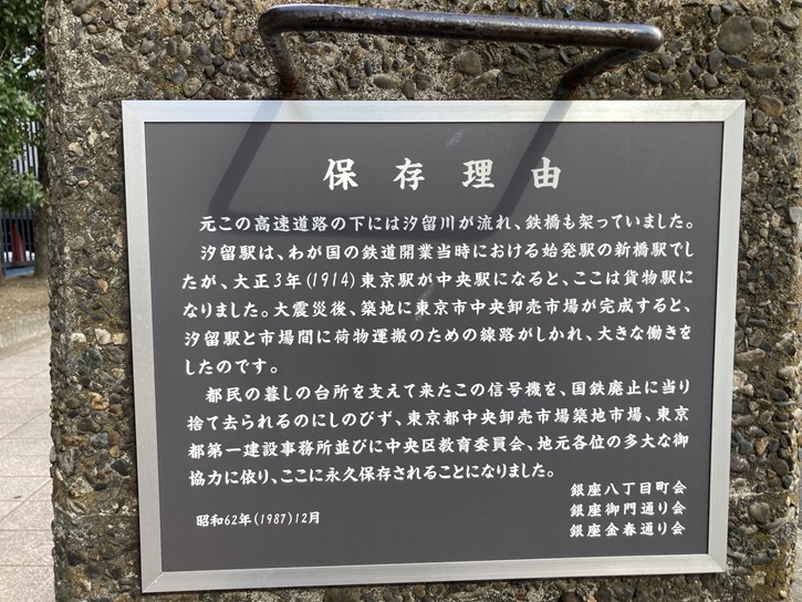 元々、この高速道路の下には汐留川が流れ、鉄橋も架っていました。汐留駅は、わが国の鉄道開業当時における始発駅の新橋駅でしたが、大正3年(1914年)東京駅が中央駅になると、ここは貨物駅になりました。大震災後、築地に東京市中央卸売市場が完成すると、汐留駅と市場間に荷物運搬のための線路がしかれ、大きな働きをしたのです。都民の暮しの台所を支えて来たこの信号機を、国鉄廃止に当り捨て去られるのにしのびず、東京都中央卸売市場築地市場・東京都第一建設事務所並びに中央区教育委員会・地元各位の多大な御協力に依り、ここに永久保存されることになりました。