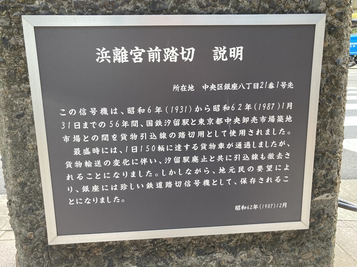 この信号機は、昭和6年(1931年)から昭和62年(1987年)1月31日までの56年間、国鉄汐留駅と東京都中央卸売市場築地市場との間を貨物引込線の踏切用として使用されました。最盛時には、1日150輌に達する貨物車が通過しましたが、貨物輸送の変化に伴い、汐留駅廃止と共に引込線も撤去されることになりました。しかしながら、地元民の要望により、銀座には珍しい鉄道踏切信号機として、保存されることになりました。