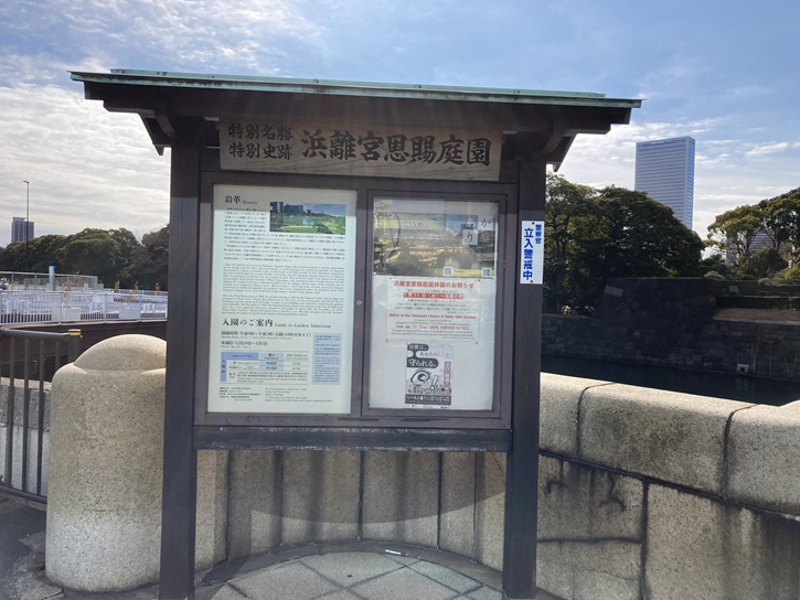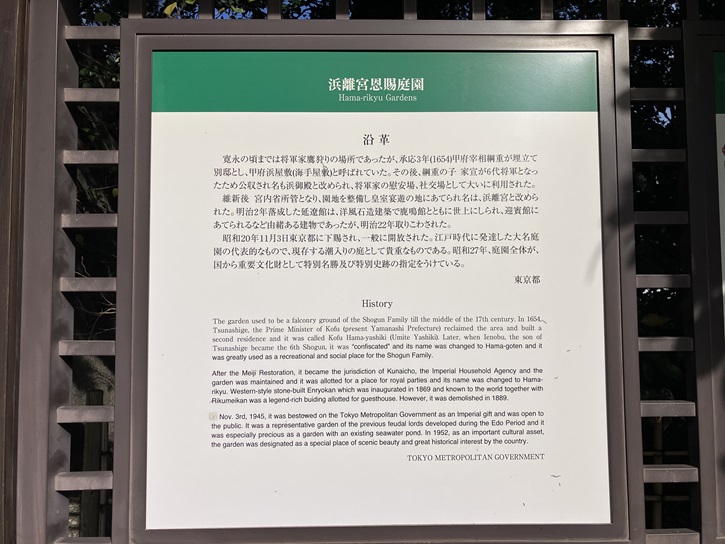 The garden used to be a falconry ground of the Shogun Family till the middle of the 17th century. In 1654, Tsunashige, the Prime Minister of Kofu (present Yamanashi Prefecture) reclaimed the area and built a second residence and it was called Kofu Hama-yashiki (Umite Yashiki). Later, when Ienobu, the son of Tsunashige became the 6th Shogun, it was "confiscated" and its name was changed to Hama-goten and it was greatly used as a recreational and social place for the Shogun Family. After the Meiji Restoration, it became the jurisdiction of Kunaicho, the Imperial Household Agency and the garden was maintained and it was allotted for a place for royal parties and its name was changed to Hamarikyu. Western-style stone-built Enryokan which was inaugurated in 1869 and known to the world together with Rikumeikan was a legend-rich buiding allotted for guesthouse. However, it was demolished in 1889. Nov. 3rd, 1945, it was bestowed on the Tokyo Metropolitan Government as an Imperial gift and was open to the public. It was a representative garden of the previous feudal lords developed during the Edo Period and it was especially precious as a garden with an existing seawater pond. In 1952, as an important cultural asset, the garden was designated as a special place of scenic beauty and great historical interest by the country.