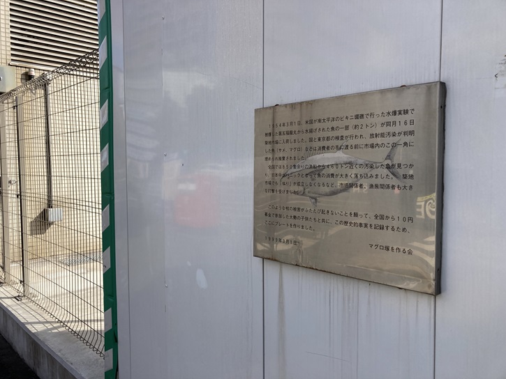 ビキニ環礁の水爆実験で放射能に汚染されたマグロの顛末をまとめたプレートが工事用の壁に残っています。