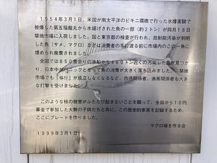 1954年3月1日、米国が南太平洋のビキニ環礁で行った水爆実験で被爆した第五福龍丸から水揚げされた魚の一部(約2トン)が同月16日築地市場に入荷しました。国と東京都の検査が行われ、放射能汚染が判明した魚(サメ、マグロ)などは消費者の手に渡る前に市場内のこの一角に埋められ廃棄されました。全国では850隻余りの漁船から460トン近くの汚染した魚が見つかり、日本中がパニックとなって魚の消費が大きく落ち込みました。築地市場でも「せり」が成立しなくなるなど、市場関係者、漁業関係者も大きな打撃を受けました。このような核の被害がふたたび起きないことを願って、全国から10円募金で参加した大勢の子供たちと共に、この歴史的事実を記録するため、ここにプレートを作りました。