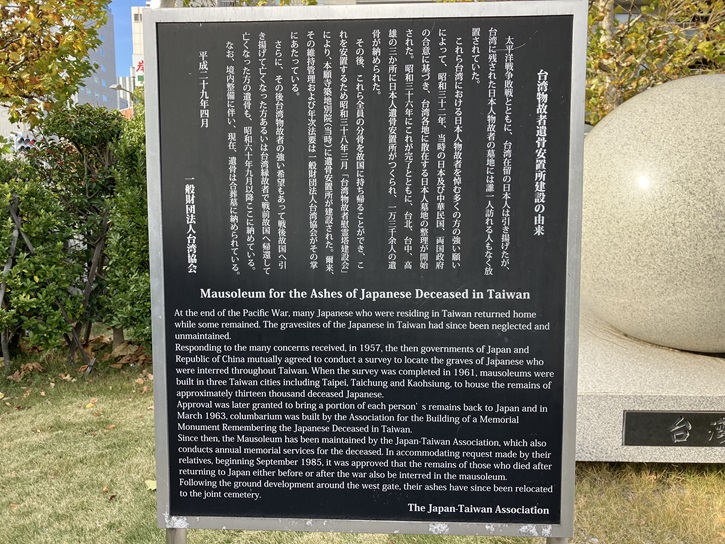 At the end of the Pacific War, many Japanese who were residing in Taiwan returned home while some remained. The gravesites of the Japanese in Taiwan had since been neglected and unmaintained. Responding to the many concerns received, in 1957, the then governments of Japan and Republic of China mutually agreed to conduct a survey to locate the graves of Japanese who were interred throughout Taiwan. When the survey was completed in 1961, mausoleums were built in three Taiwan cities including Taipei, Taichung and Kaohsiung, to house the remains of approximately thirteen thousand deceased Japanese. Approval was later granted to bring a portion of each person' s remains back to Japan and in March 1963, columbarium was built by the Association for the Building of a Memorial Monument Remembering the Japanese Deceased in Taiwan. Since then, the Mausoleum has been maintained by the Japan-Taiwan Association, which also conducts annual memorial services for the deceased. In accommodating request made by their relatives, beginning September 1985, it was approved that the remains of those who died after returning to Japan either before or after the war also be interred in the mausoleum. Following the ground development around the west gate, their ashes have since been relocated to the joint cemetery.