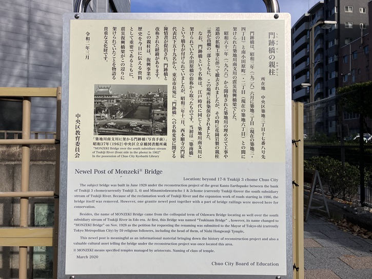 門跡橋は、昭和三年(一九二八年)六月に築地三丁目(現在の築地三・四丁目)と南小田原町一・二丁目(現在の築地六丁目)との間に架けられた築地川南支流の震災復興橋梁でした。昭和六十一年(一九八六年)から開始された築地川の埋め立て工事や道路の拡幅工事に伴って撤去されましたが、その時に花崗岩製の親柱一基が高欄の一部とともに、この場所に移築保存されました。なお、門跡橋という名称は、江戸時代に同じく築地川南支流に架けられていた小田原橋の俗称から取ったものです。当初は「築南橋」という橋名が付けられていましたが、昭和三年十一月、西本願寺の門徒代表以下五十九名から、東京市長宛に「門跡橋」への名称変更に関する陳情書が提出され、門跡橋と改称された経緯があります。この親柱は、復興事業の歴史を今日に伝える資料として重要であるとともに、震災復興橋梁がこの辺りに架けられていたことを物語る貴重な文化財です。