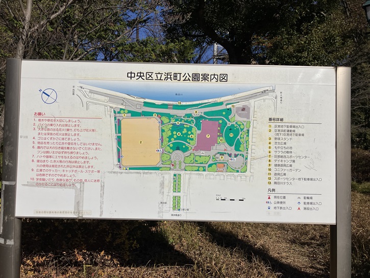 スタート地点の浜町公園から歩き始めます。浜町公園は、中央区の公園の中では最大の面積を持ち、区を代表する公園として知られています。1923年の関東大震災の後、後藤新平の主導による帝都復興事業(帝都復興公園)の一環として、隅田公園・錦糸公園と併せて計画・整備され、昭和四年(1929年)に開園しました。此の地には、江戸時代には一橋徳川家、笠間藩主・牧野氏、弘前藩主・津軽氏、熊本藩主・細川氏の下屋敷が置かれ、明治期以降も細川家の邸宅がありました。浜町公園は細川家の庭園跡に造られ、現在では、隅田川の眺望を眺めながらバーベキューが楽しめる施設や、運動広場の他、中央区立総合スポーツセンターがあります。