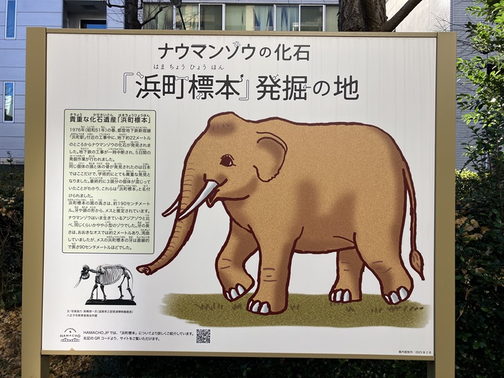 昭和五十一年(1976年)の春、都営地下鉄新宿線「浜町駅」付近の工事中に、地下約22メートルのところからナウマンゾウの化石が発見されました。地下鉄の工事が一時中断され、5日間の発掘作業が行われました。同じ個体の頭と体の骨が発見されたのは日本ではここだけで、学術的にとても貴重な発見となりました。最終的に3頭分の個体が混じっていたことがわかり、これらは「浜町標本」と名付けられました。浜町標本の肩の高さは、約190センチメートル。牙や頭の形から、メスと推定されています。ナウマンゾウはいま生きているアジアゾウと比べ、同じくらいかやや小型のゾウでした。芽の長さは、おおきなオスでは約2メートルあり、湾曲していましたが、メスの浜町標本の牙は直線的で長さ90センチメートルほどでした。