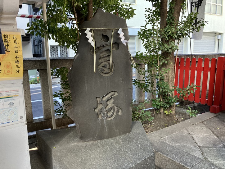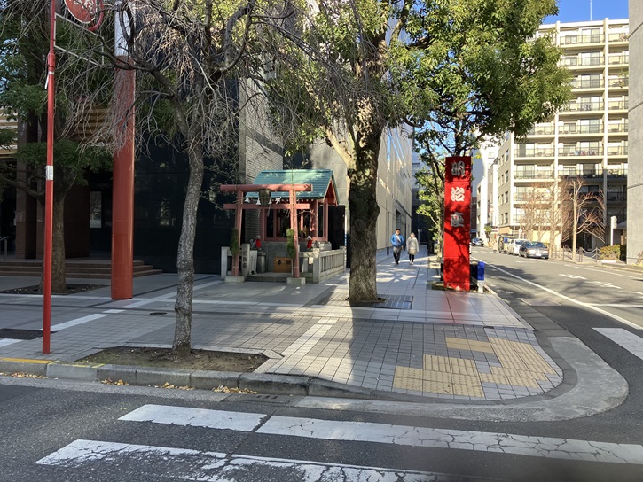 浜町通りの反対側に明治座があります。明治座の建物の南東角に小さな神社が祀られています。神社の創建は不詳ですが、明治座が「喜昇座」として開場した明治六年(1873年)以降といわれています。鳥居の扁額には「笠間出世稲荷大明神」と書かれていますが、通称は「明治座稲荷神社」と呼ばれています。正式には「笠間稲荷神社明治座分社」で、明治座の繁盛を祈るために笠間稲荷神社東京別社から勧請されたそうです。明治座の出演者・演出者やファンの人達が興行の成功を祈願することも多いそうです。