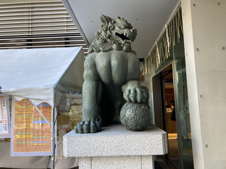 狛犬の一方は口を開けて前足で玉を守り、もう一方は口を閉じ子犬を守る姿が印象的な一対の狛犬です。其々、吐く息と吸う息「阿吽(あうん)」を表し、魔除けとしての意味合いもあります。この狛犬は、ブリヂストンの創立者である石橋正二郎氏が奉納しました。