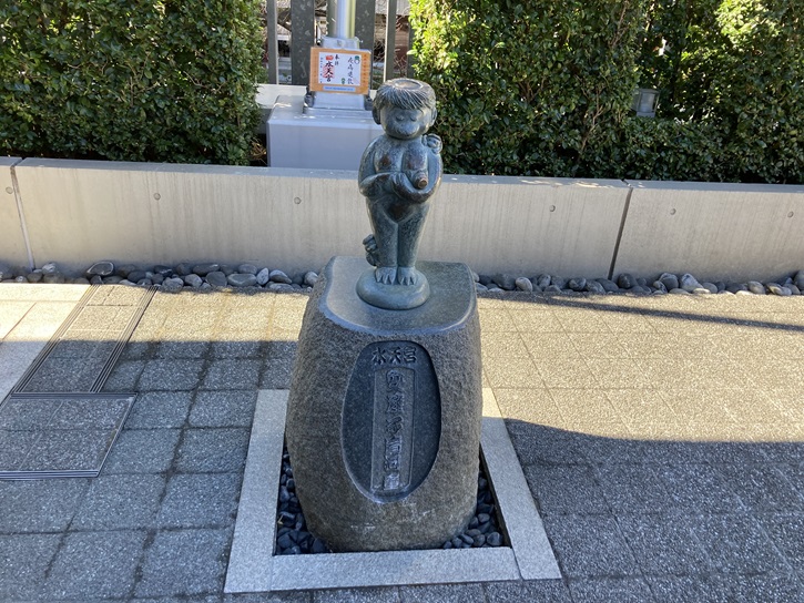 安産子育河童像は、足下と胸・肩に赤ちゃん河童がしがみついている姿が印象的な仲睦まじい河童の親子を表しています。