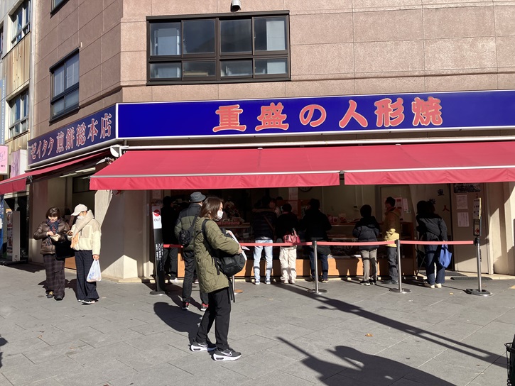 水天宮から人形町からくり櫓に向かいます。水天宮交差点の角に重盛永信堂のお店があります。日本橋人形町で人形焼といえば、まず名前が上がる有名店です。大正六年10月に創業してから100年以上に渡って営業をしている老舗です。初代社長の重盛永治氏は、明治三十八年に信州伊那から上京し、東京の煎餅屋を振り出しにして大阪でも修行しました。10年ほどの歳月を掛けてようやく辿り着いたのがゼイタク煎餅でした。昭和初年に店舗を現在の水天宮前交差点に移した祭に、当時まだ珍しかった飛行機を広告に活かそうと考え、重盛永信堂が初めて飛行機に宣伝チラシを積んで空からふりまきました。東京中の人々は驚き、たちまちゼイタク煎餅の名が広まったそうです。それから四代目の今日まで、粋好みの江戸っ子たちに親しまれるお菓子を作り続けています。