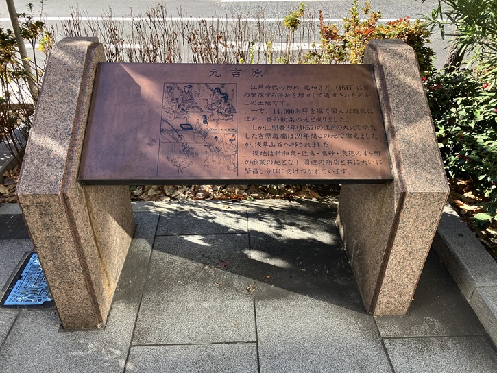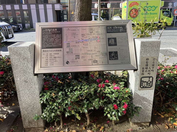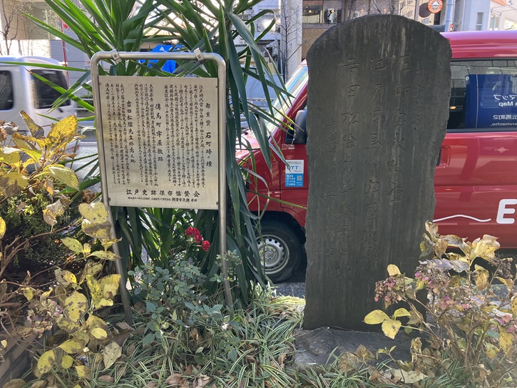 浜町公園から緑道となっている浜町通りを通って清洲橋通りに向かいます。植え込みの中に「浜町標本発掘の地」の案内板が立っています。
