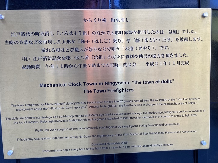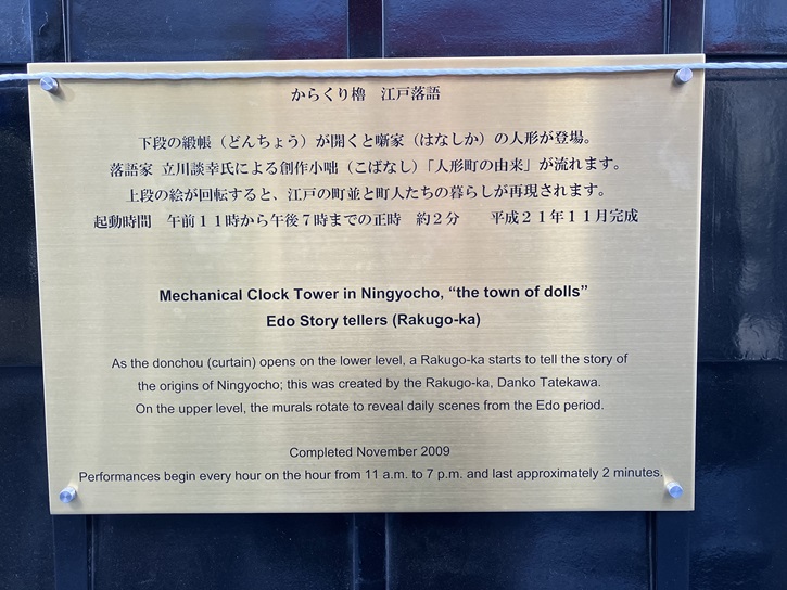人形町通りを挟んで、からくり櫓が2ケ所に設置されています。ひとつは「江戸落語」をテーマにしたものです。残念ながら私が歩いていたときにはからくりは演じられませんでしたが、運が良ければ楽しめたかも。外国人観光客には受けるかもしれませんね。