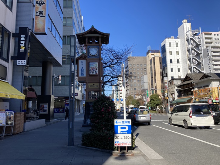 もう1基のからくり櫓ですが、甘酒横丁交差点の手前に設置されています。しかし、2025年1月に再訪した時は地下鉄の駅の工事のために撤去されていました。なので、以下は2022年1月当時の写真です。