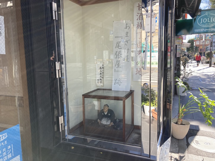 甘酒の尾張屋は昭和の終わり頃まで商売していましたが、現在はその跡地が王英堂という和菓子屋さんになっていて、お店の入口横にここが尾張屋だったことを展示しています。