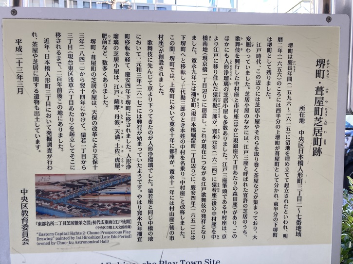 江戸が開府され20年ほど過ぎ、現在の人形町交差点北側一帯には江戸唯一の歓楽街が在り大変な賑わいでした。大芝居の中村座と市村座の江戸二座では歌舞伎が上演され、また人形操り芝居、浄瑠璃芝居、見世物小屋が軒を並べ、それに携わる多くの人形師達がこの町に住んでいたことから、江戸時代より俗に「人形丁通り」と呼ばれ後に町名となりました。正式に「人形町」という町名がついたのは関東大震災以降の区画整理で昭和八年になってからです。