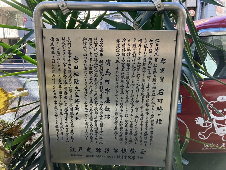 この場所には伝馬町牢屋敷がありました。江戸の町に時を知らせた「石町時の鐘」が移設されています。