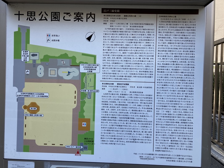小伝馬町交差点を渡った先を左折すると十思公園があります。公園の入口に巨大な案内板が立っています。
