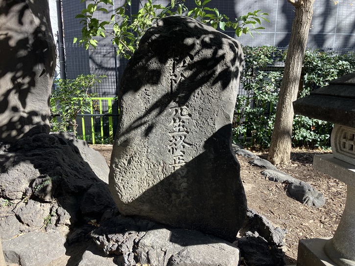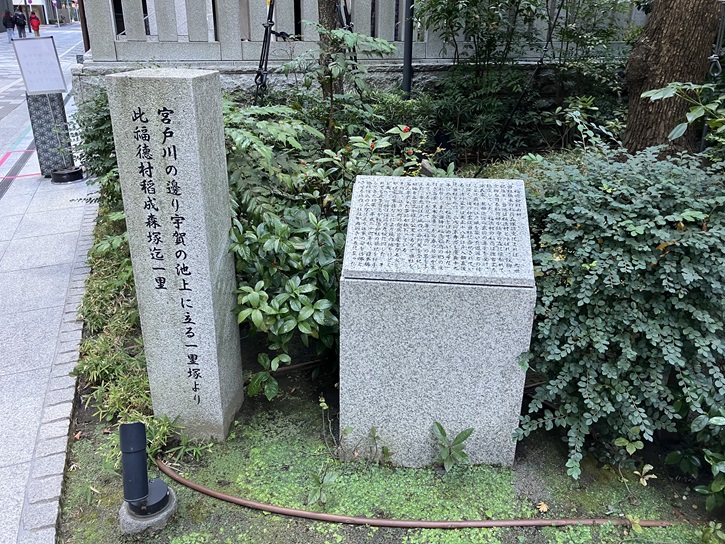 石碑の隣に石柱が建っています。土地の人は、鎮守の森の一端に建てられていた里程標(石造一里塚)を「稲荷の一里塚」と呼んでいたそうです。しかし、明暦三年(1657年)正月8日の大地震により、一里塚は崩壊してしまいました。