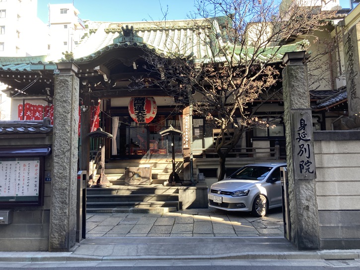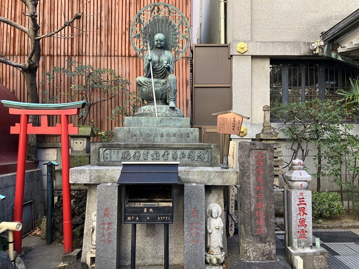 抑も此の地伝馬町は 江戸時代 徳川幕府の牢獄の所在せし所なり。当山開基山科俊海大僧正 明治初年 高野山より錫を六本木の五大山不動院に留め 化を十方に布く、時 偶々此の地伝馬町牢 処刑場跡に燐火の燃ゆるを見 大悲禁ずる能わず 幾万余の知られざる無告の霊 鬼哭愁々として寄辺なるを弔ひ、又安政の大獄で知られる吉田松陰等 当地で処刑された勤王の志士の霊を慰め 又一つには 牢跡を以て浄地となし 四隣の繁栄に資せん事を希念し、明治五年より勧進し、同八年一宇を建立。高野山より弘法大師を勧請し本尊となす。又処刑場跡には延命地蔵菩薩を建立し 堂塔 伽藍を整備(現十思公園を含む) これを当山の??とす。爾来尊崇の信仰を聚め都心に輪喚笑の美を競うも 大正十二年の大震火災に?ゝり、昭和四年今日の規模となり 現在に及ぶ、昭和廿九年都史蹟指定