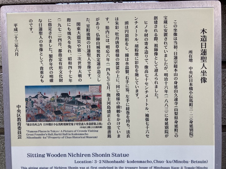 この坐像は当初、日蓮宗総本山の身延山久遠寺(山梨県身延町)の宝蔵に安置されていましたが、明治十六年(1883年)に身延別院が創建される際、祖師像として迎えられました。ヒノキ材の寄木造りで、像高七十センチメートル、袖張七十六センチメートル、胡粉地に彩色を施しています。頭は円頂形をし、瞳は水晶製、右手に笏、左手に経巻を持ち、法衣は朱彩、牡丹唐草模様の袈裟の上に、同じ模様の横(被)をかけています。胎内には、明応六年(1497年)七月、施主河島盛正との墨書銘があり、仏師山城発教定蓮が造立した、室町後期の日蓮聖人坐像です。関東大震災や第二次世界大戦の際にも焼失を免れ、昭和四十七年(1972年)四月、都指定有形文化財に指定されました。製作年代の明確な日蓮聖人の坐像として、貴重なものです。