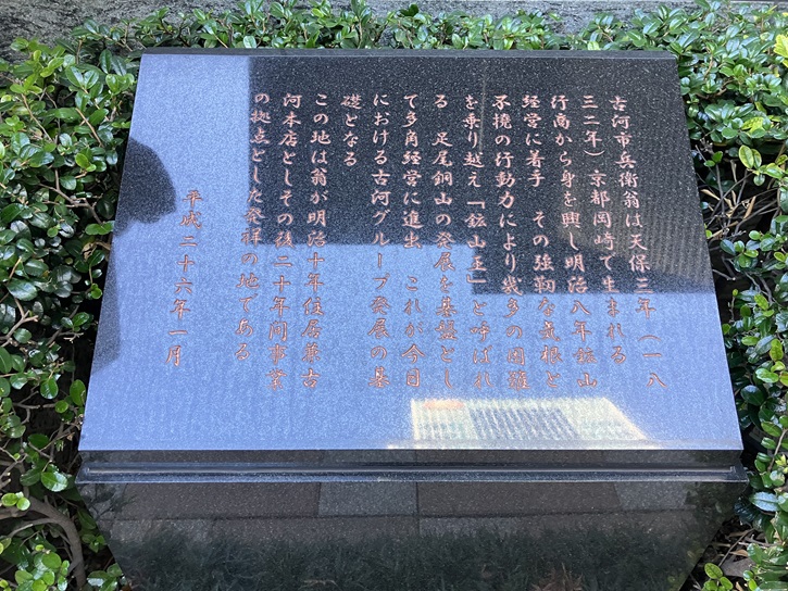 古河市兵衛翁は天保三年(1832年)京都岡崎で生まれる。行商から身を興し、明治八年鉱山経営に着手。その強靭な気根と不撓(ふとう:どのような困難にあっても屈しないこと)の行動力により幾多の困難を乗り越え「鉱山王」と呼ばれる。足尾銅山の発展を集婆として多角経営に進出。これが今日における古河グループ発展の基礎となる。この地は翁が明治十年住居兼古河本店とし、その後二十年間事業の拠点とした発祥の地である。