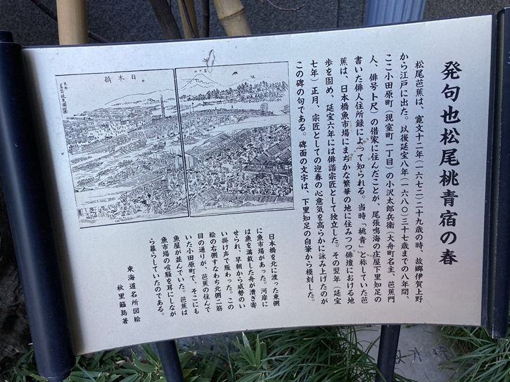 「日本橋 鮒佐」の店先に松尾芭蕉の句碑が建てられています。松尾芭蕉が江戸へ来て最初に住んだ場所がここ小田原町です。