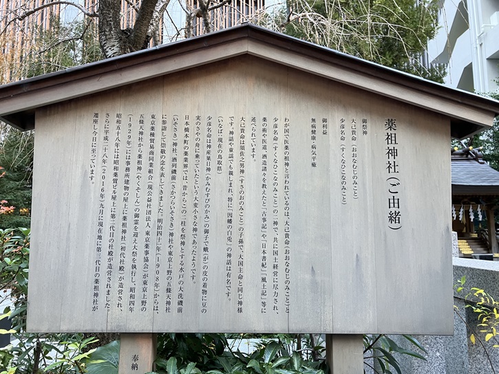 わが国で医薬の祖神と言われているのは、大己貴命(おおなむじのみこと)と少彦名命(すくなひこなのみこと)の二神で、共に国土経営に尽力され、薬の術や医道、酒造諸々を教えたと「古事記」や「日本書紀」「風土記」等に述べられています。大己貴命は須佐之男神(すさのおのみこと)の子孫で、大国主命と同じ神様です。神話や童謡でも親しまれ、特に「因幡の白兎」の神話は有名です。(いなば:現在の鳥取県)少彦名命は神産巣日神(かみむすびのかみ)の御子で蛾(が)の皮の着物に豆の実のさやの舟に乗っていたという大変小さな神であったようです。日本橋本町の業界では、昔からこの二柱を祭神とする水戸の大洗磯前(いそさき)神社、酒列磯前(さかつらいそさき)神社や東京上野の五條天神社に参詣して崇敬の念を表してきました。明治四十一年(1908年)からは、東京薬種貿易商同業組合(現公益社団法人東京薬事協会)が東京上野の五條天神社から薬祖神(やくそしん)の御霊を迎え大祭を執行し、昭和四年(1929年)には事務所建物の屋上に薬祖神社(初代社殿)が造営され、昭和五十八年には昭和薬貿ビル屋上に第二代目の社殿が造営されました。さらに平成二十八年(2016年)九月に現在地に第三代目の薬祖神社が遷座し今日に至っています。