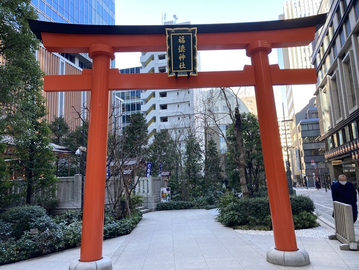 福徳神社は、貞観年間(859年〜876年)には既にこの地に鎮座していたとされています。日本橋室町二丁目付近は、昔は武蔵国豊島郡福徳村(あるいは野口村福徳)と呼ばれていて、その地名から「福徳稲荷」と呼ばれました。徳川秀忠が慶長十九年(1614年)の正月28日に参詣した際、椚の皮付き鳥居に春の若芽の萌え出でたのを見て、福徳神社の別名である「芽吹稲荷」と名付けたとされています。明治七年(1847年)8月9日に「村社」に列され、社号も「福徳稲荷」から「福徳神社」へと変わりました。関東大震災や戦後の再開発などに伴う4度の遷座を経て、平成二十六年(2014年)に日本橋室町東地区開発に伴ってコレド室町の北隣りの区画に鎮座しました。それまでは、半世紀ほどビルの屋上に置かれていました。