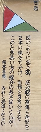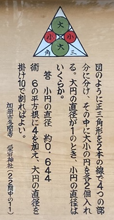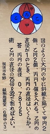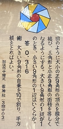 加須市には現存する算額が非常に多くあります。ここに挙げた4問はその一部です。ここ福徳神社との神縁によりこれを御覧の方々の中から加須の算額を一面でも、実際に見聞される方がおいでになればこれに勝る喜びはありません。
