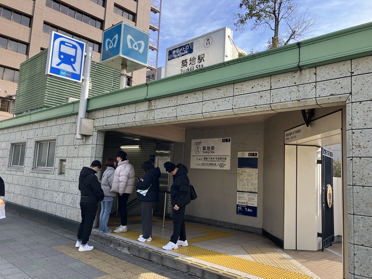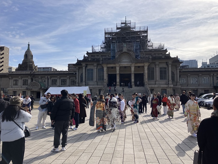 築地駅出入口1は築地本願寺の正門脇に位置しています。境内は着飾った和服の若い女性で一杯です。どうやら今日(2025年1月19日)は週遅れの成人式のようです。
