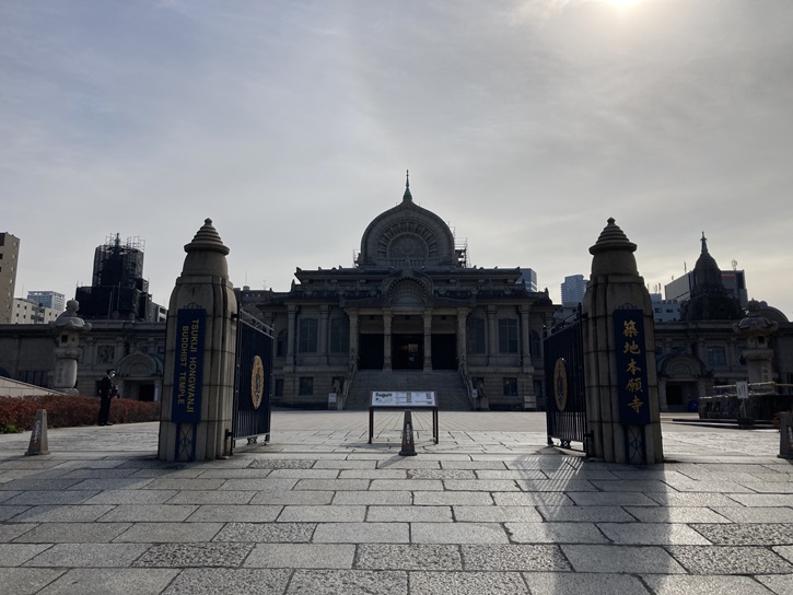 (HENCE THE NAME "TSUKIJI", MEANING BUILT LAND). THE PRESENT INDIAN-STYLE STRUCTURE WAS ERECTED IN 1934.