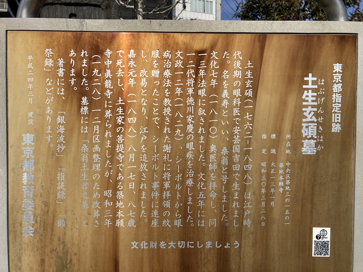 土生玄碩(1762年〜1848年)は江戸時代後期の眼科医で安芸国吉田で生まれました。名を義寿といい、桑翁と号しました。文化七年(1810年)奧医師を拝命し、同十三年法眼に叙されました。文化五年には十二代将軍徳川家慶の眼疾を治療しました。文政十二年(1829年)、シーボルトから眼病治療法を教授された謝礼に将軍拝領の紋服を贈ったことで、シーボルト事件に連座し、改易となり、江戸を追放されました。嘉永元年(1848年)八月十七日、八十七歳で死去し、土生家の菩提寺である築地本願寺中眞龍寺に葬られましたが、昭和三年(1928年)十二月区画整理のため改葬されました。墓標には「桑翁土生君之墓」とあります。著書には、「銀海波抄」・「指談録」・「獺祭録」などがあります。
