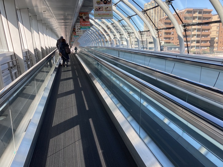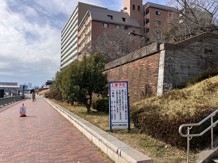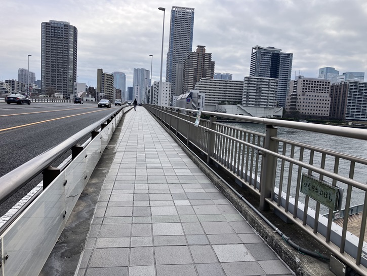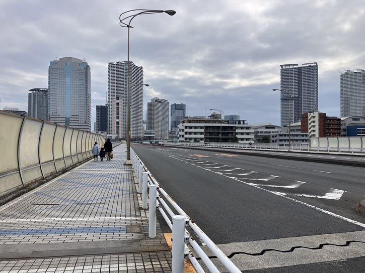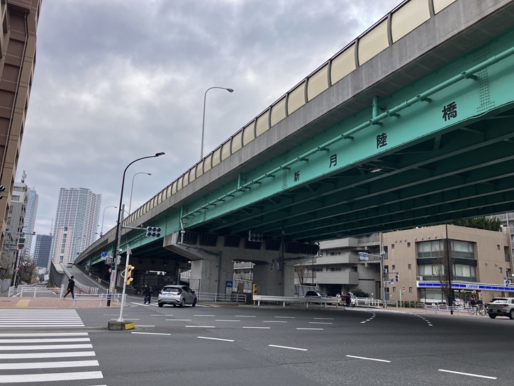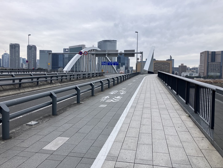 初見橋交差点脇から新月陸橋の長いスロープを上がります。新月陸橋は、佃大橋と朝潮大橋を高低差なく繋ぐために架けられた陸橋です。新月陸橋は徒歩で渡ることができませんので、佃大橋と朝潮大橋を通して歩く歩行者は一旦新月陸橋の下の歩道に下りて歩く必要があります。東京マラソンを走った際には、車道がコースになっていましたので、朝潮運河を渡りきるまで佃大橋が続いているものとばかり思っていました。ヘロヘロでそんなことを考える余裕がなかったこともありますが。